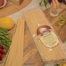 Лингуине - классические итальянские макаронные изделия из региона Кампания. Готовятся из муки твердых сортов пшеницы. Они тоньше, чем феттучине, и ближе по форме к спагетти, их длина более 10 см, но слегка сплюснуты - имеют вид узкой вермешелевидной плоски. Когда готовят лингвини, их не ломают, а варят целыми. В отличие от других макаронных изделий, подаются с рыбой, морепродуктами и соусом песто. Кулинары утверждают, что густой соус к лингвини не подходит. Основная пищевая ценность пасты заключается в высоком содержании сложных углеводов, насыщающих организм энергией и дающих ощущение сытости на длительное время, в том числе: витамины группы В и Е и микроэлементы, входящие в состав макаронных изделий, поддерживают стабильную жизнедеятельность биологических систем организма, клетчатка впитывает и выводит, из организма токсины и тяжёлые металлы, крахмал перевариваясь, преобразуется в глюкозу, аминокислота триптофан, образующаяся в пасте во время варки, повышает настроение и улучшает сон.